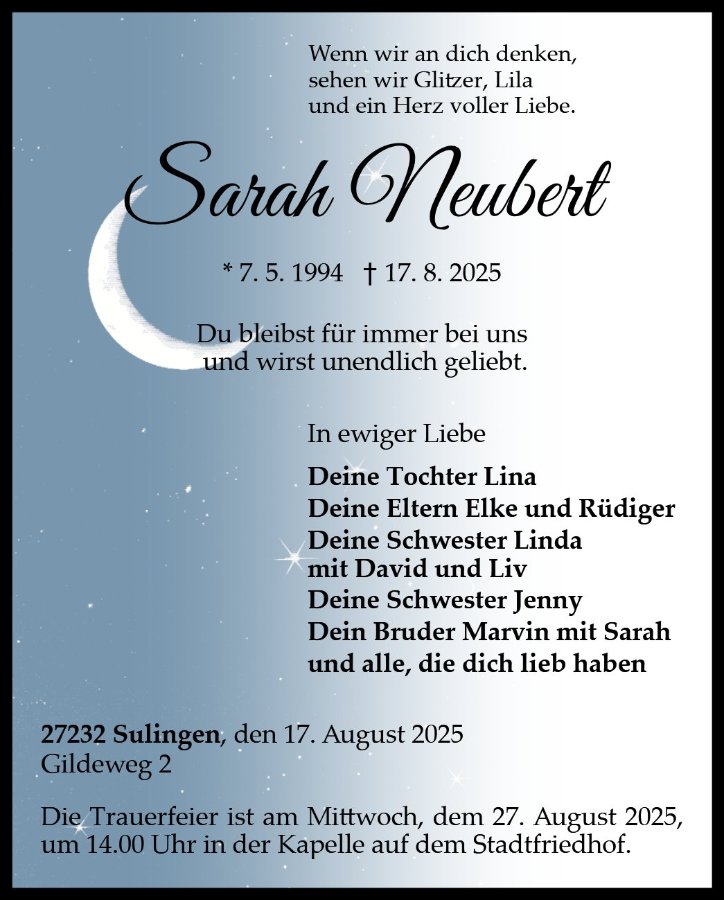 Wenn wir an dich denken, sehen wir Glitzer, Lila und ein Herz voller Liebe.